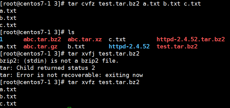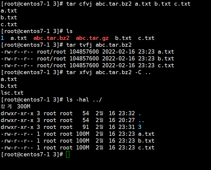 -j : bz2 확장자 ex) # tar cvfj abc.tar.bz2 a.txt b.txt c.txt