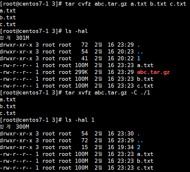 - z : gz 확장자 ex) # cvfz abc.tar.gz a.txt b.txt c.txt