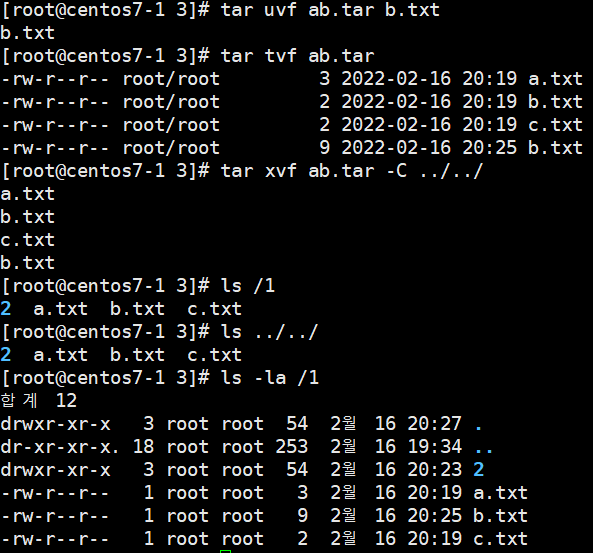 > uvf 옵션을 이용하여 ab.tar에 b.txt를 업데이트. 아카이브 확인 과정에서 같은 파일이 여러개 나오더라도