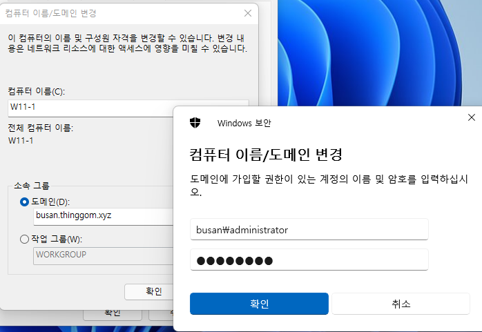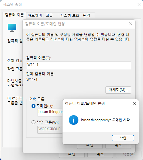 - w11에서 자식도메인 멤버서버로 설정/ sysdm.cpl