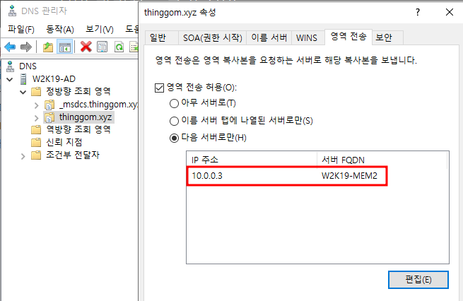 - ad 서버 부모도메인에서 mem2 자식도메인 서버에게 dns 정보를 보내기 위해 dns 영역전송 설정
