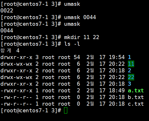 - 기본 u 마스크는 0022로 새로운 디렉토리는 그룹과 일반사용자들에게 2를 뺀 755의 권한을 가진다. 또한 새로운 파 일은 그룹과 일반사용자들에게 2를 뺀 644의 권한을 가진다.