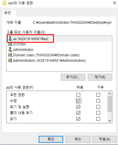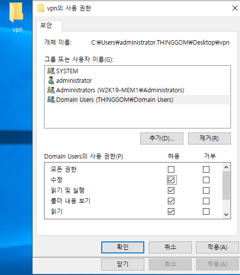 - VPN이름을 가지는 공유 폴더 생성 및 사용 권한 유저 추가