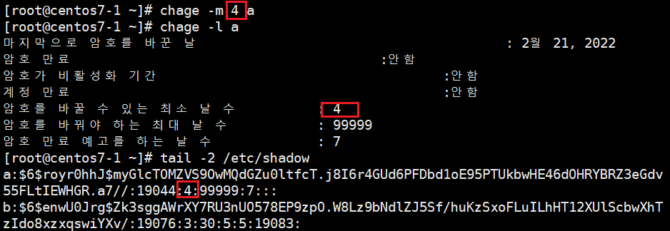 ex.1) a 사용자의 최소 패스워드 사용일을 4일로 지정