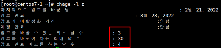 ->> useradd z 명령어를 통해 사용자 z를 생성 후 chage -l 명령어로 확인.