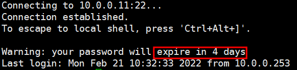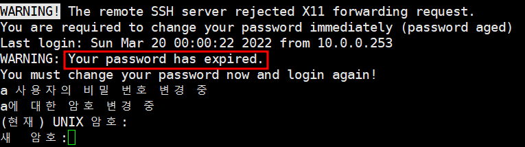 ex.2) 유예기간에 해당하는 날짜로 변경하여 확인. 패스워드가 만료되었다고 뜨지만 비밀번호를 변경하여 사용할 수 있음.
