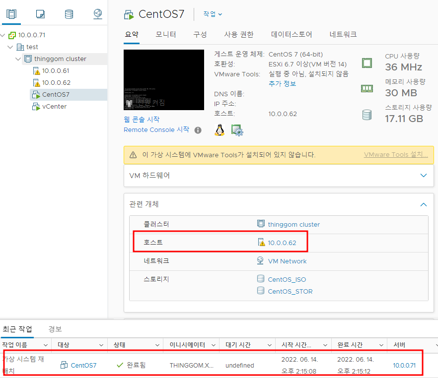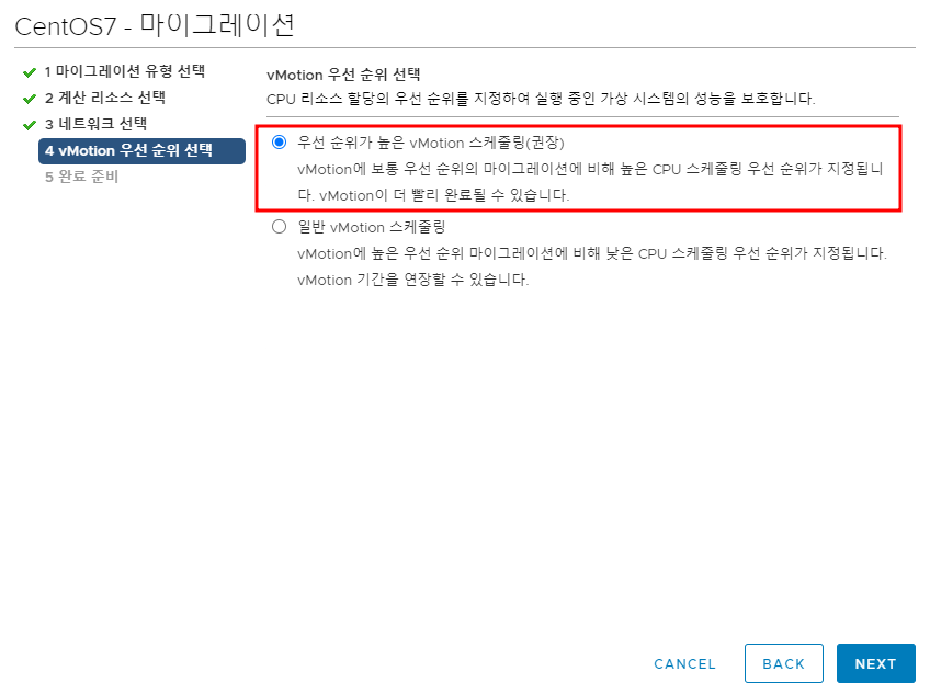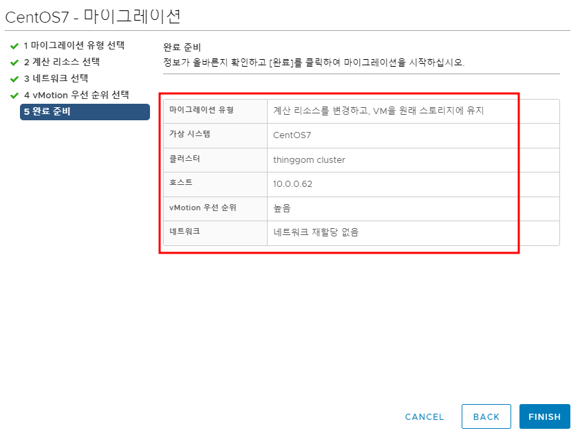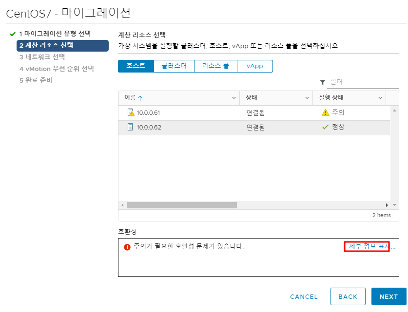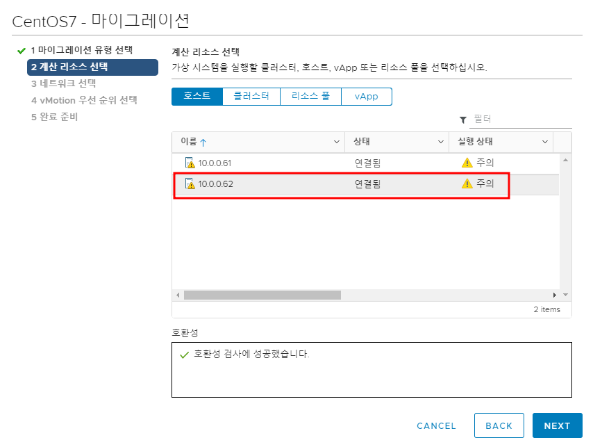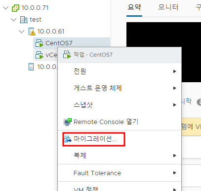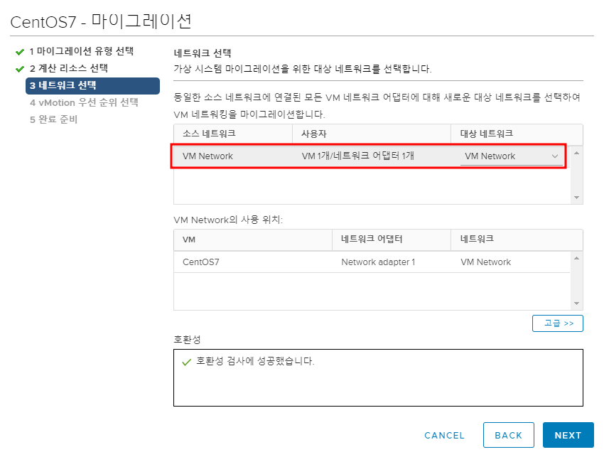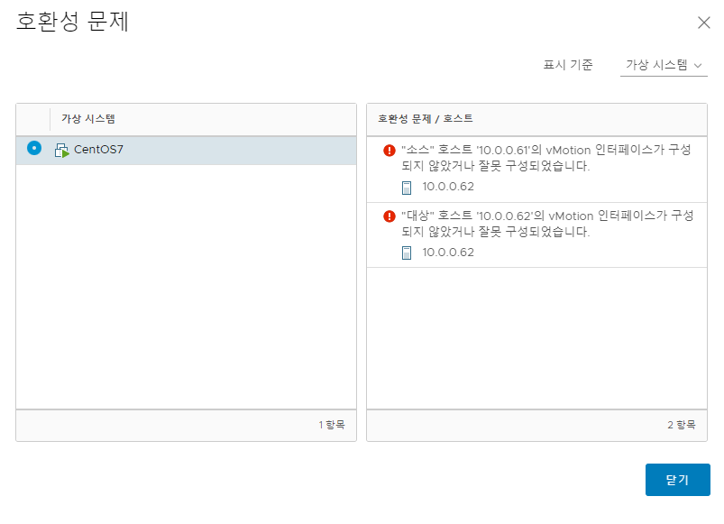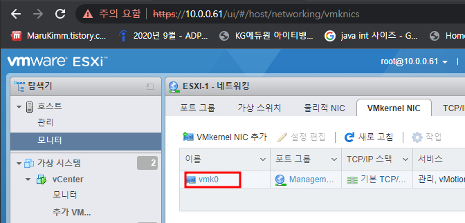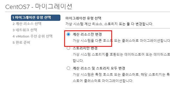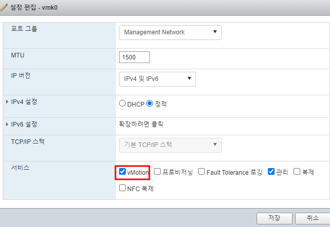 - 네트워크 설정 변경 : 네트워크 추가 vmotion 사용 체크 : 두 호스트 모두 진행