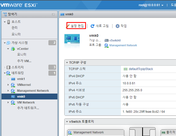 - 메모리 4gb를 가지는 또 다른 ESXi-1 생성 : IP = 10.0.0.62